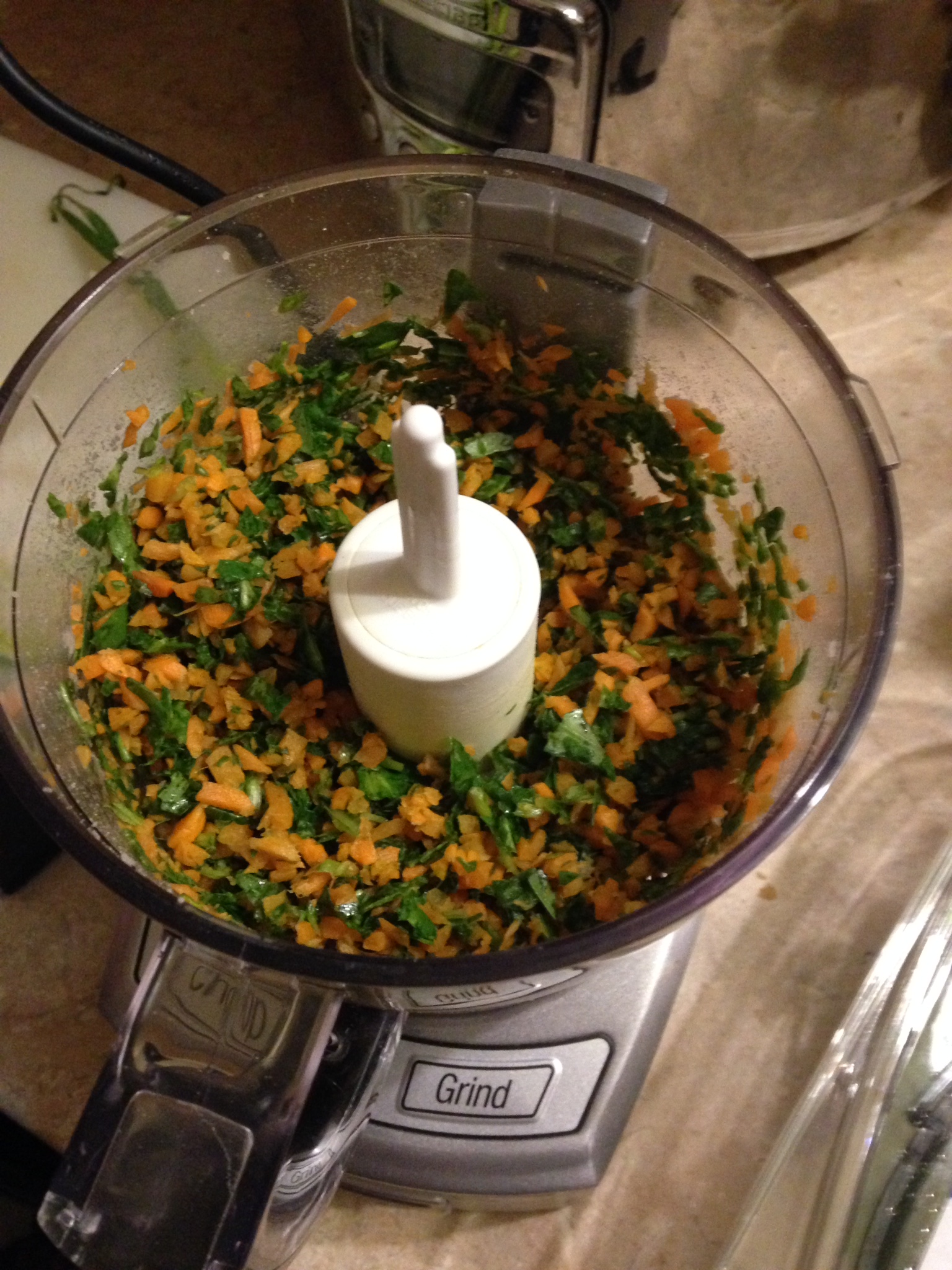 One of my favorite wedding gifts was this handy little 4 cup chopper by Cuisinart (If you’re interested you can find it here: http://www.bedbathandbeyond.com/store/product/cuisinart-reg-elite-collection-4-cup-chopper-grinder/121759). So the first step was to chop up the potato, skin and all.  Next I used the chopper for the rest of the baby spinach and a couple of handfuls of the carrots.